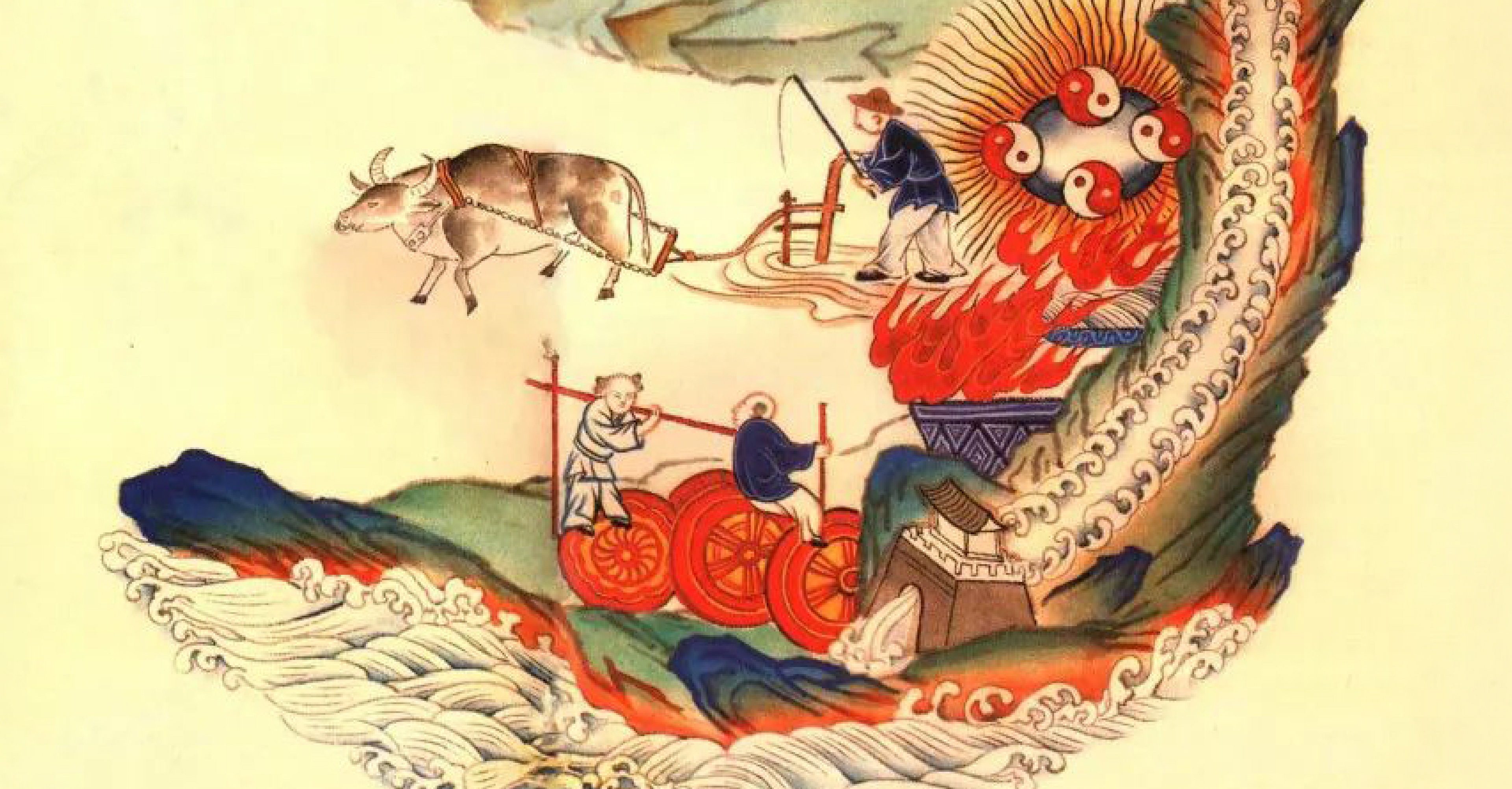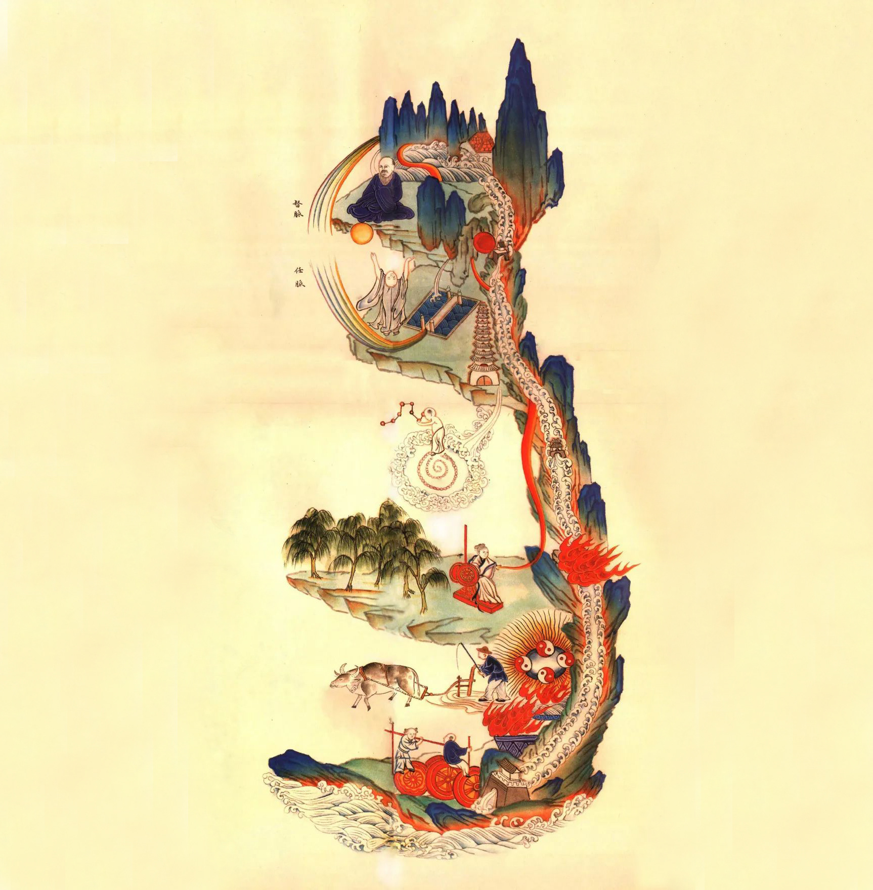 Here's where the alchemy really begins: as this water is redirected upward, it transforms into a fiery furnace that heats up the lower Cinnabar Field (your lower energy center, located in your lower abdomen). This area is marked by four Yin-Yang symbols representing the four external elements; Wood, Fire, Metal, and Water. The fifth element, Soil (Earth), sits at their center where they all meet. Just to the left of this Cinnabar Field, you'll see an "iron buffalo plowing the earth and planting the golden coin." This beautiful image represents the very first seed of the Golden Elixir beginning to form.