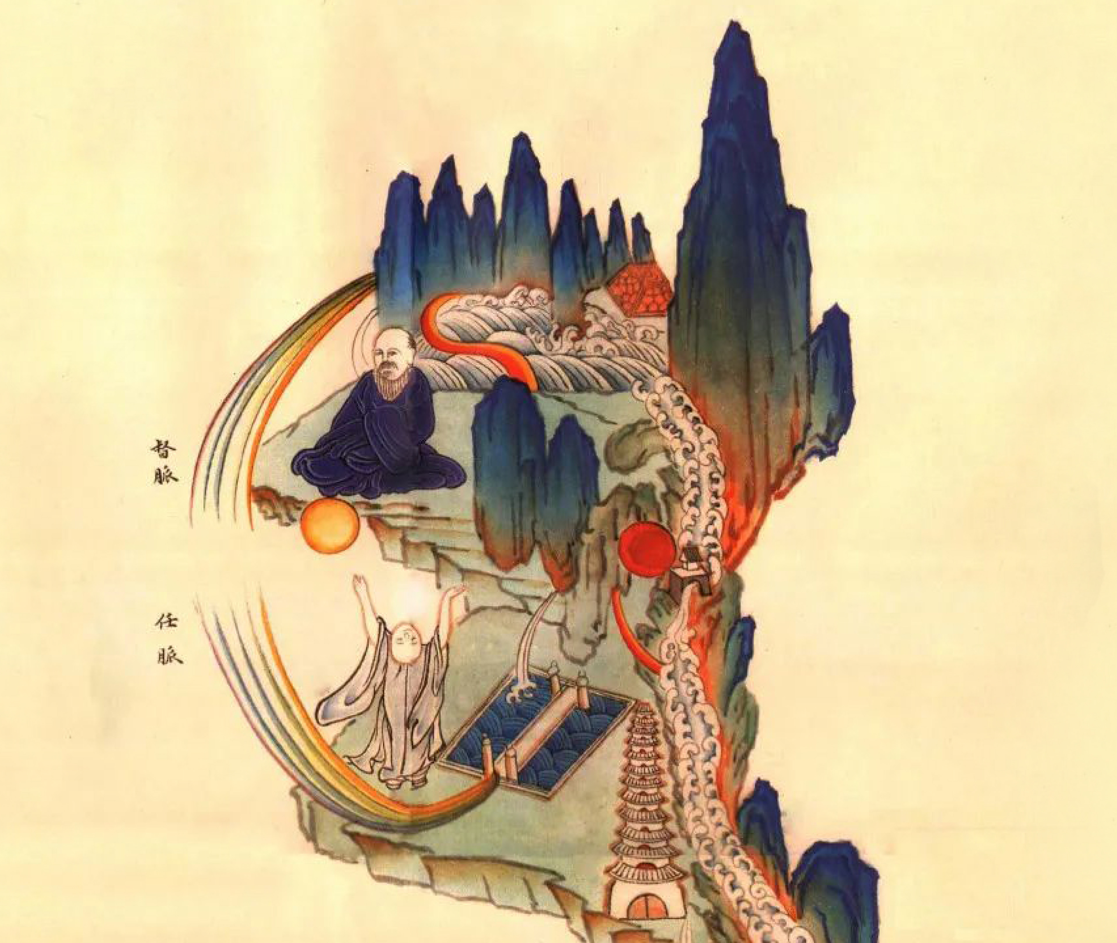 Behind those mountain peaks on the left side, the Control vessel (dumai) emerges. This is the energy channel that runs up the back of your body along your spine. Sitting peacefully next to it is Laozi himself, the ancient sage who founded Daoism. Below the Control vessel, the Function vessel (Renmai) begins, this channel flows down the front of your body. Standing there with his arms raised is Bodhidharma, the legendary monk who brought Chan (Zen) Buddhism from India to China.